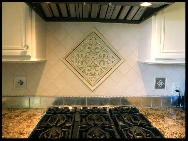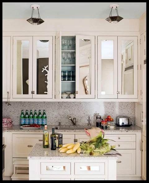 The bottom row of antique silvered tile backsplash deepen the countertops giving the illusion of more space. Glass inset into the panels of upper cabinet doors brightens and enlarges a small kitchen.