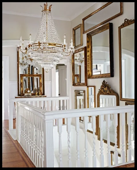 A collection of mirrors in different shapes and sizes hung in a salon-style arrangement going up the stairs or in the hall way not only bring light to a usually darkened space but the mirrors become the art that neutralizes and creates a place for the eye to rest before entering colorful and patterned bedrooms, bathrooms, offices, etc.