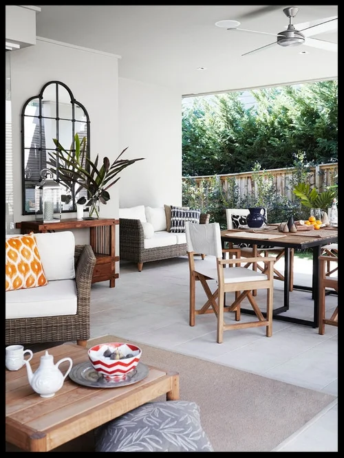 A mirror in a patio sitting area makes the outdoor space feel more like an actual room. Reflected candle light at night creates an enchanting ambiance.