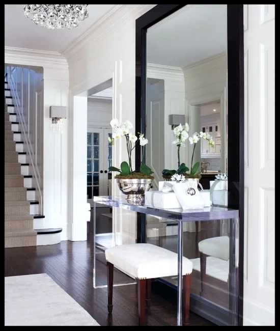 I always use a mirror in the entry in my work. A small one by the door allows you the easy luxury of a last minute once over before dashing out or greeting guests. Entry ways usually lack a window. Hanging a large mirror catches ambient light and brightens a dark foyer.